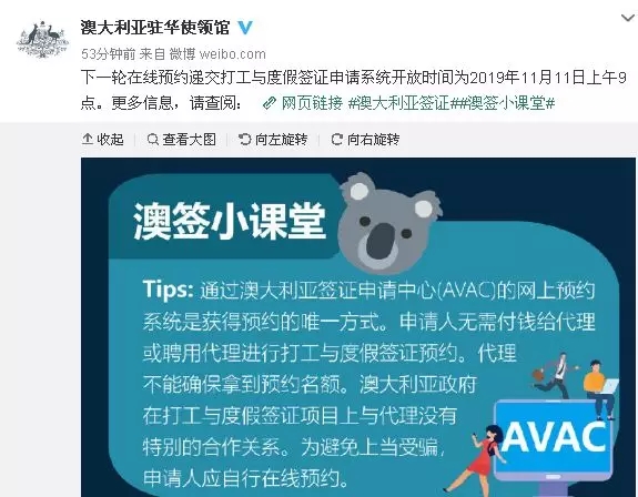 下一輪在線預約遞交打工與度假簽證申請系統(tǒng)開放時間為2019年11月11日上午9點。