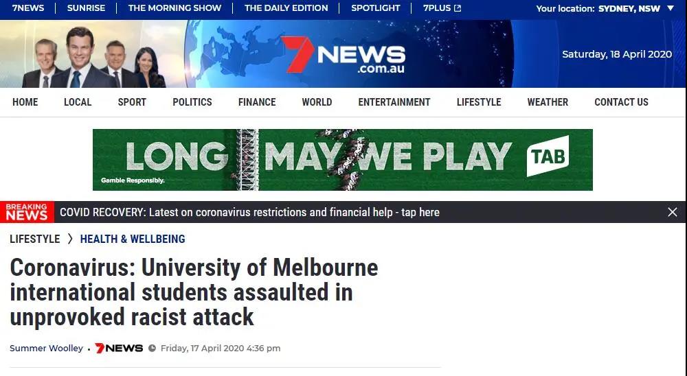 據澳大利亞媒體“7 news”4月17日報道,當地時間周三(15日),兩名中國留學生在澳大利亞墨爾本市遭到來自兩名陌生人的種族主義攻擊。此事迅速引發外界關注,墨爾本市長對此發表譴責稱,這種暴力行為是完全不可接受的。