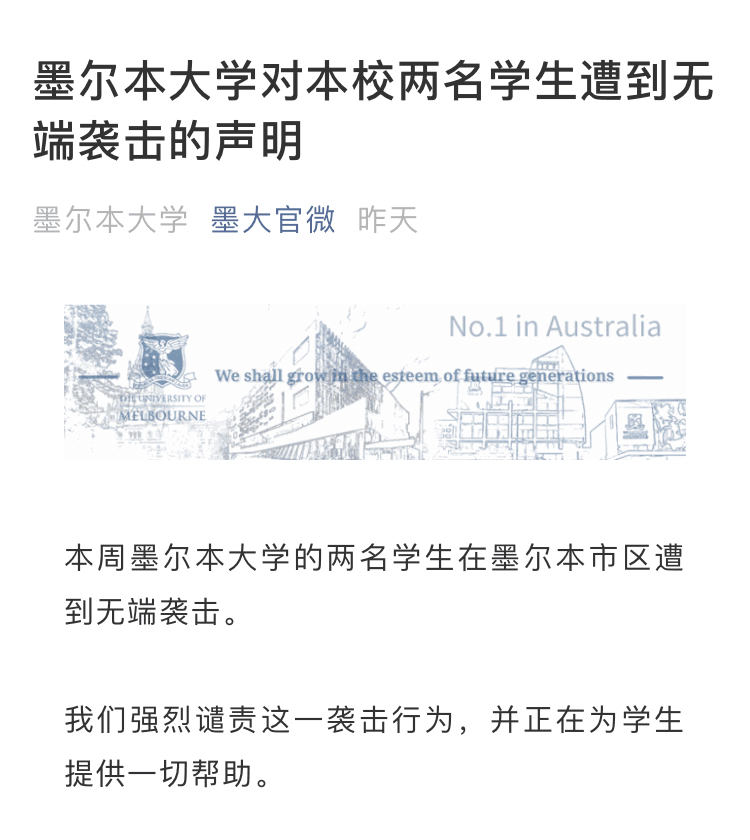 得知此事后,墨爾本大學也通過多個社交媒體平臺就此事發聲。墨爾本大學校長鄧肯·馬斯克爾教授表示,他對這次無端襲擊感到非常震驚并強烈譴責。