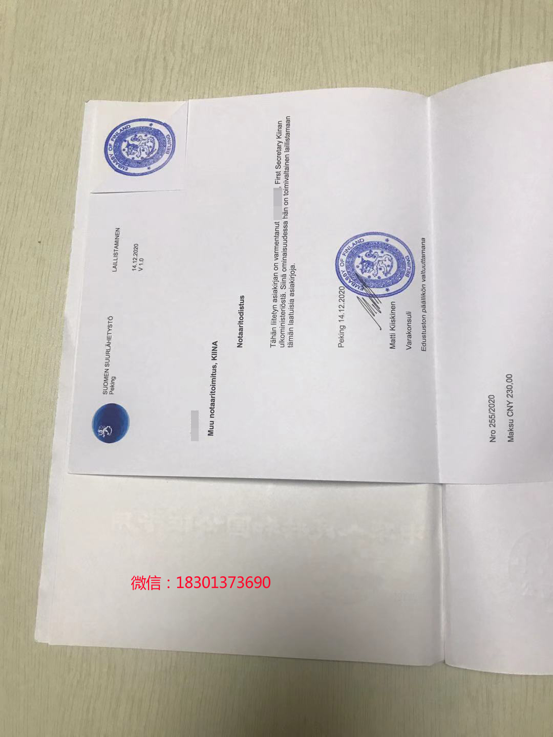 今天取出芬蘭雙認證,這個是顧先生的認證文件,顧先生是我們公司的老客戶,之前所需要的文件認證都是由我們公司代辦的,顧先生人在芬蘭,辦理入籍需要使用結婚證公證書做芬蘭使館認證,由于公證書也在芬蘭,顧先生通過DHL國際快遞把公證書原件郵寄給我們,差不多用了3天,我們就收到了顧先生的公證書,我們給顧先生遞交的芬蘭雙認證加急服務,差不多用了十個工作日左右,芬蘭雙認證就辦理好了,顧先生對我們的服務感到非常滿意,我們通過DHL國際快遞幫顧先生把公證書郵寄到了芬蘭,全程辦理都非常的順利。