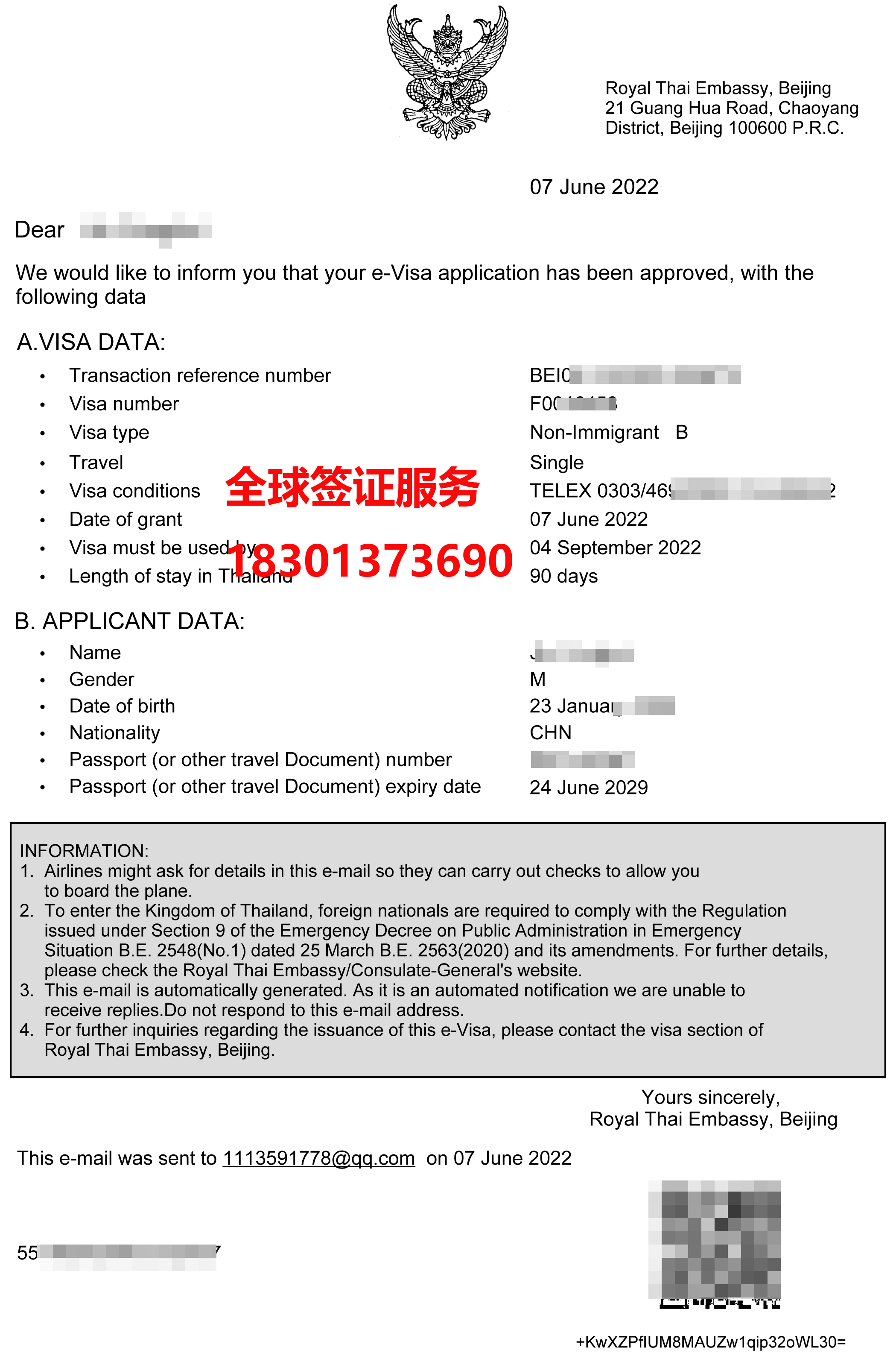 河南省,靳先生泰國商務(wù)簽證順利出簽