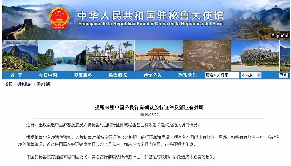 中國駐秘魯使館提醒赴秘中國公民,務(wù)必在出行前確認(rèn)所持旅行證件和簽證有效期,以免造成不必要的損失。