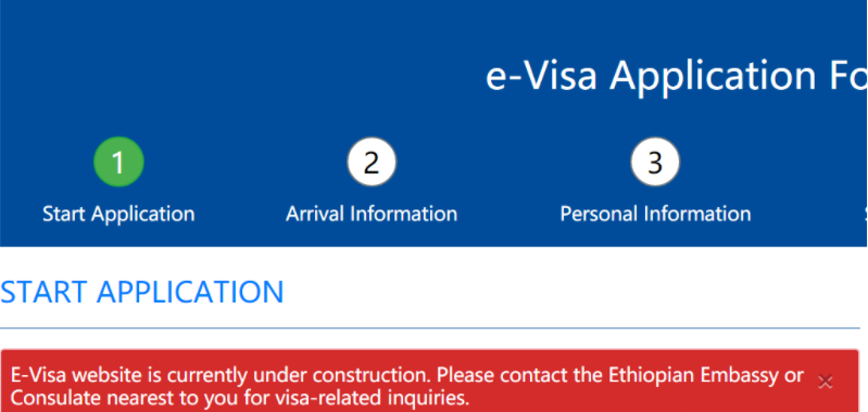 埃塞俄比亞電子簽證網站截圖中的紅字提示:電子簽證網站建設中,請聯系就近的埃塞俄比亞大使館或領事館咨詢簽證相關事宜。