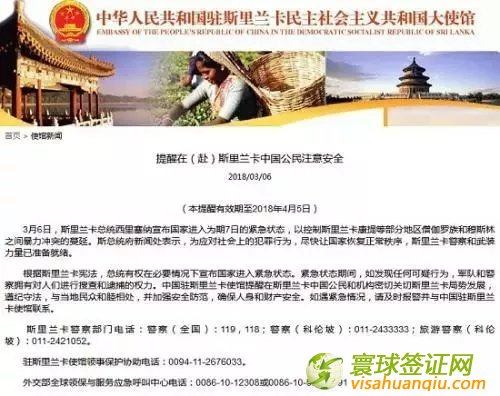 中國駐斯使館提醒說,在康提地區工作、生活、旅游的中國公民宵禁期間應留在家中或賓館,如遇緊急情況及時報警并與使館聯系尋求協助,近日有計劃前往康提的中國公民要隨時關注形勢變化。