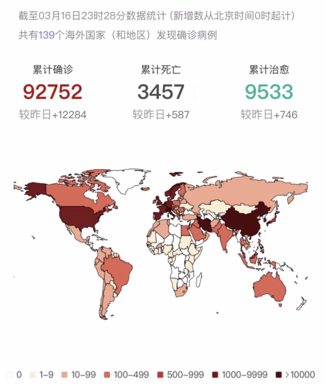 全球已有140個國家出現(xiàn)疫情,境外確診92752例 死亡3457。