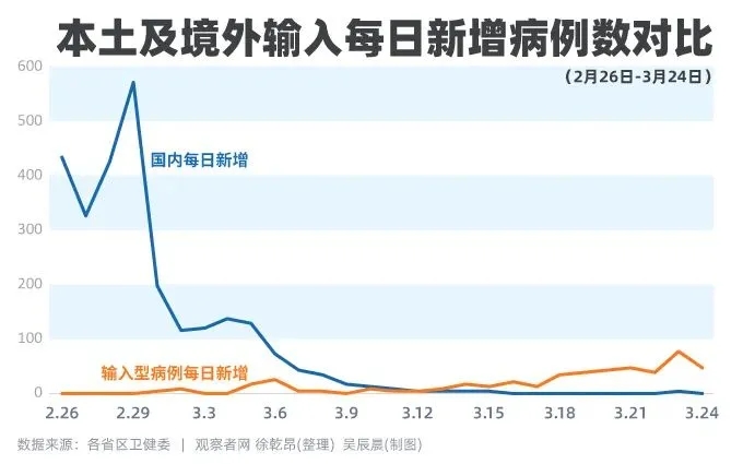 3月18日,全國新增34例確診病例,均為境外輸入型病例。3月21日,廣東出現全國首例境外輸入關聯病例,為一名土耳其輸入確診病例的密切接觸者。當天除這例病例外,全國新增的45例病例,均為境外輸入型病例。