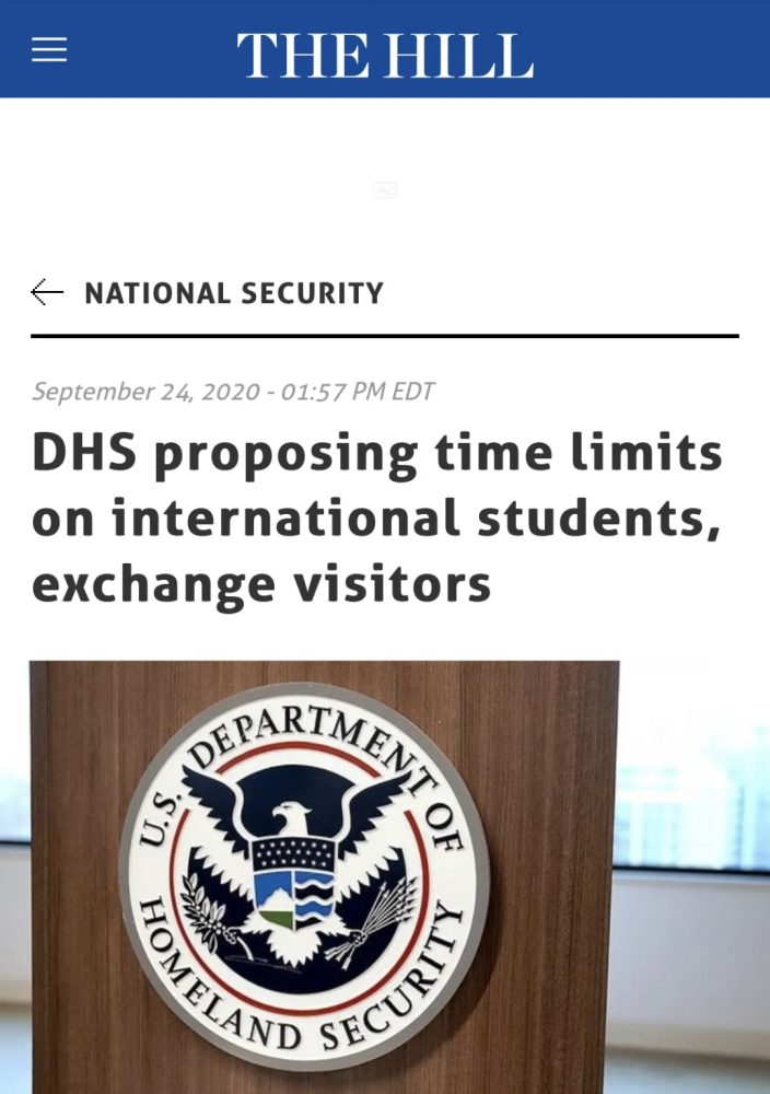 國土安全部發布的“規則制定建議通知”,則擬取消F(外國學生)、J(交流訪問學者)和I(外國媒體代表)類簽證目前實行的“身份持續時間”(Duration of Status)制。