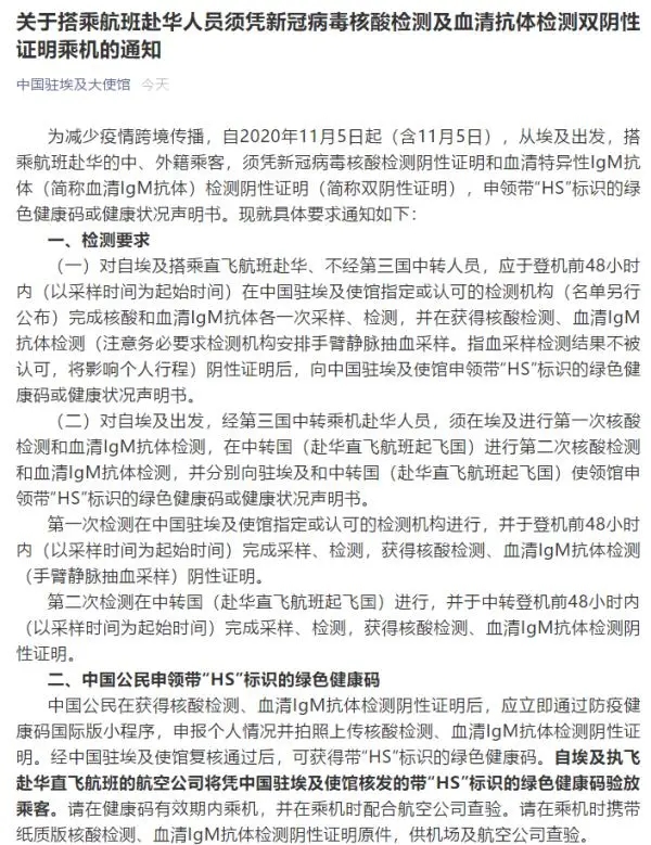 中國駐埃及大使館11月1日發布通知,稱自2020年11月5日起(含11月5日),從埃及出發,搭乘航班赴華的中、外籍乘客,須憑新冠病毒核酸檢測陰性證明和血清特異性IgM抗體(簡稱血清IgM抗體)檢測陰性證明(簡稱雙陰性證明),申領帶“HS”標識的綠色健康碼或健康狀況聲明書。