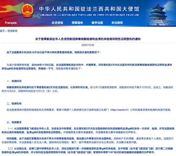 10月30日,中國駐法國大使館發布通知,自2020年11月6日起,自法國搭乘航班赴華的中、外籍乘客,須憑登機前2天內在法國采樣的新冠病毒核酸檢測陰性證明和血清特異性IgM抗體檢測陰性證明登機,兩者缺一不可。此外,法國戴高樂機場自10月30日起不再為轉機乘客提供檢測。