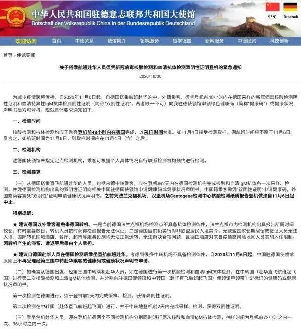 10月30日,中國駐德國大使館發布通知,自2020年11月6日起,自德國搭乘航班赴華的中、外籍乘客,須憑登機前48小時內在德國采樣的新冠病毒核酸檢測陰性證明和血清特異性IgM抗體檢測陰性證明,向駐德使領館申領綠色健康碼或健康狀況聲明書后方可登機。