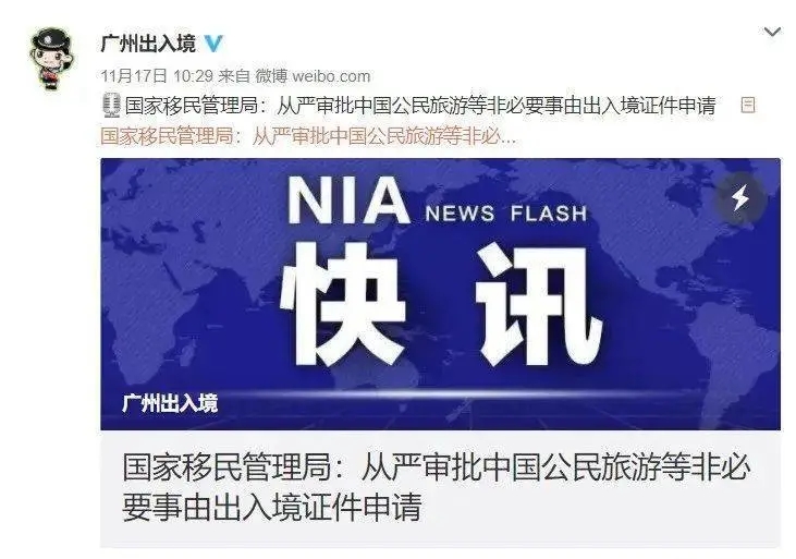 廣州出入境官微也轉(zhuǎn)發(fā)了移民管理局的該條“從嚴(yán)審批旅游等非必要事由出入境證件申請(qǐng)”。