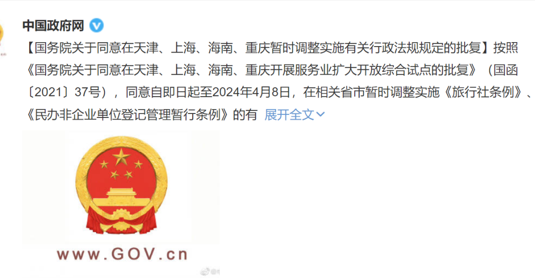 一、按照《國務院關于同意在天津、上海、海南、重慶開展服務業擴大開放綜合試點的批復》(國函〔2021〕37號),同意自即日起至2024年4月8日,在相關省市暫時調整實施《旅行社條例》、《民辦非企業單位登記管理暫行條例》的有關規定(目錄附后)。