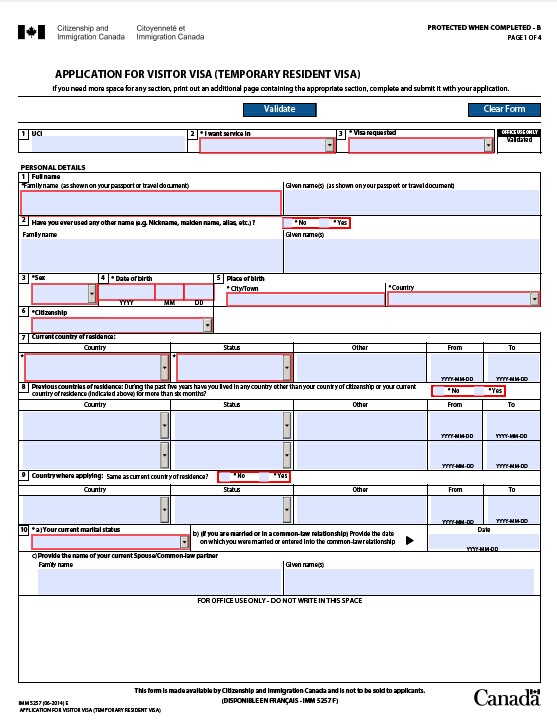 1、臨時居民訪問簽證申請表(IMM5257E)