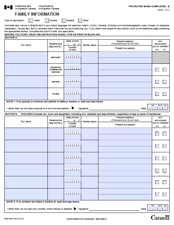 申請加拿大商務簽證必須要遞交臨時居民訪問簽證申請表(IMM5257E)、家庭信息表(IMM5645E)、教育和就業細節表3個表格