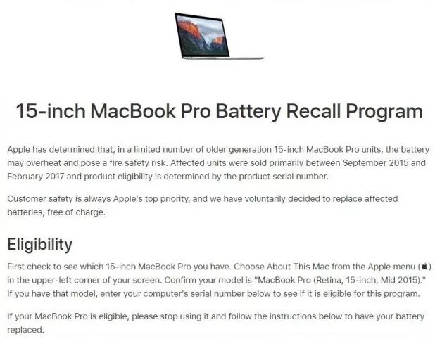 大家只需要在蘋果公司公布的網頁內將序列號輸入,即可查看自己的電腦是否在更換范圍內。具體產品序列號可通過https://support.apple.com/15-inch-macbook-pro-battery-recall查詢。