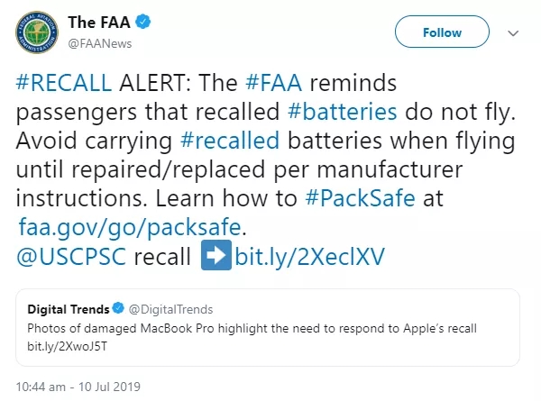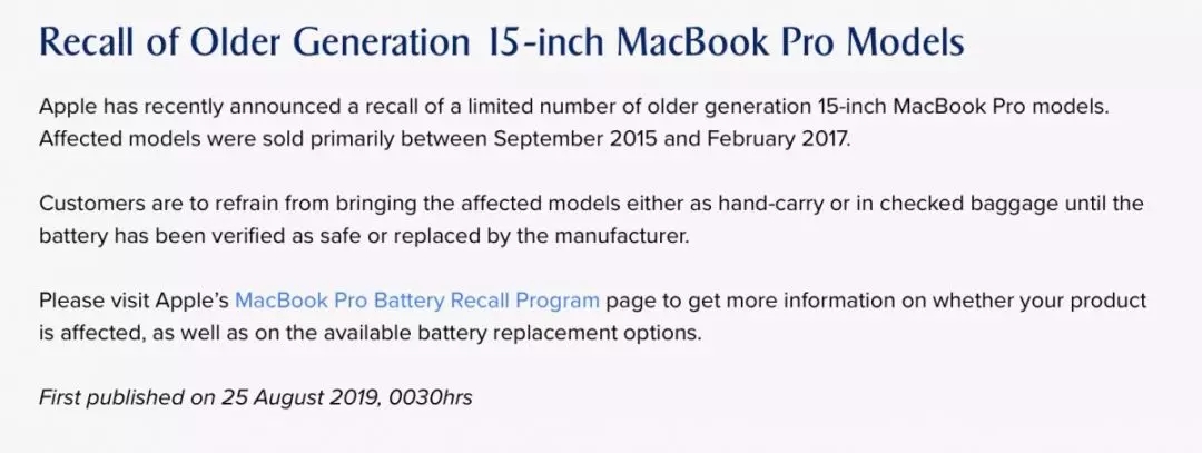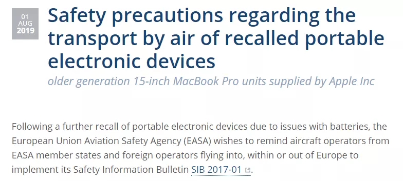 同樣地,本月早些時候,歐盟航空安全局(EASA)對這些蘋果筆記本電腦機型也發出了警告,要求該地區的航空公司嚴格遵守2017年的規定,關閉含有被召回鋰離子電池的設備,不得在飛行中使用。