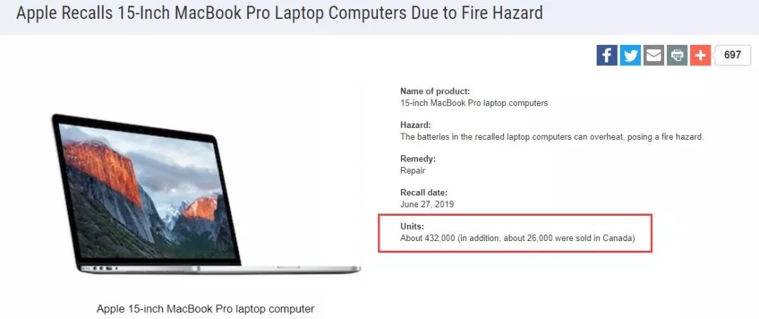 據召回信息顯示,美國一共有43.2萬臺受影響的15寸MacBook Pro筆記本電腦。而本次召回,加拿大也受到影響,共有2.6萬臺該類型的蘋果筆記本電腦。