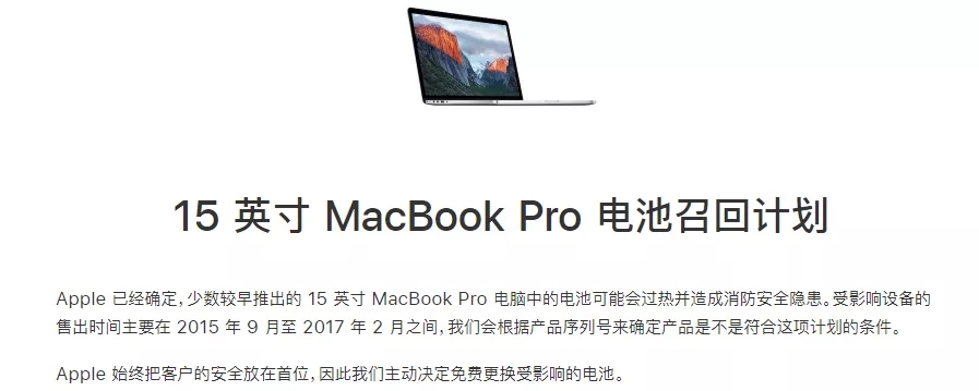 蘋果此次召回計劃針對的是在2015年9月和2017年2月之間售出的15英寸MacBook Pro機型,由于這期間部分機型搭載Retina屏幕的15吋MacBook Pro筆電型號電池,可能存在過熱且起火的風險,因此呼吁用戶停止使用,同時也宣布將為受影響用戶免費更換電池。
