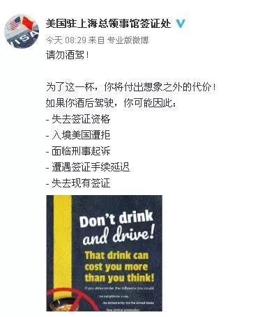 美國駐上海總領(lǐng)事館簽證處發(fā)布提示請勿酒駕!為了這一杯,你將付出想象之外的代價!