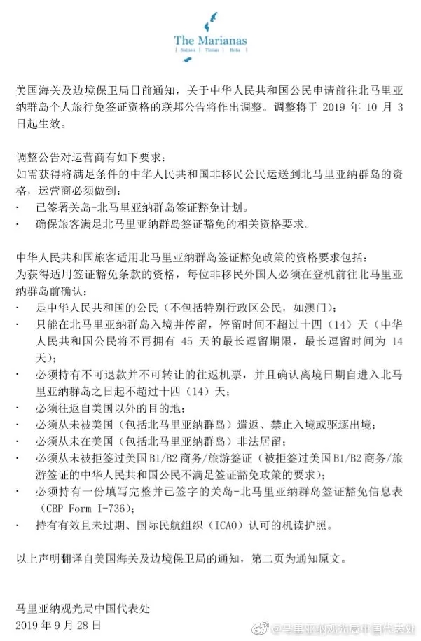 據@馬里亞納觀光局中國代表處 發布的最新消息,關于中華人民共和國公民申請前往北馬里亞納群島個人旅行免簽證資格的聯邦公告將做出調整。調整將于2019年10月3日起生效。