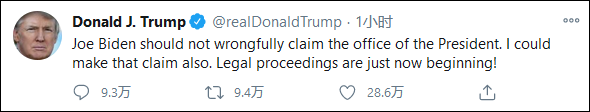 隨后CNN也緊急報道,喬·拜登憑借賓夕法尼亞州的20票選票,他在他出生的州取得勝利后,現在總擁有290票,贏得壓倒性勝利;當選總統喬·拜登將在晚上8點ET發表全國講話,目前他也更改了自己的推特簡歷。