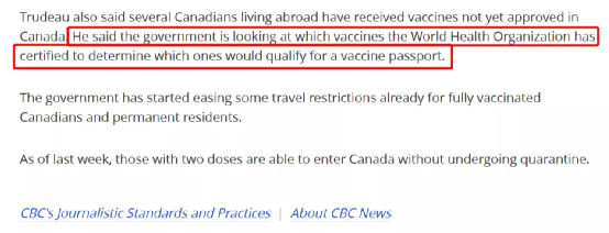 7月14日,特魯多鄭重表示:加拿大正在研究WHO已經(jīng)認(rèn)證的各款疫苗,以確定之后疫苗護(hù)照的認(rèn)可范圍。