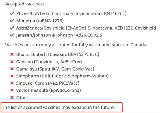 加拿大政府官網(wǎng)上也明確表示未來可能會對認(rèn)可名單進(jìn)行擴(kuò)張,其中就包括中國的康希諾疫苗(Cansino)、科興疫苗(Sinovac)、國藥疫苗(Sinopharm)。