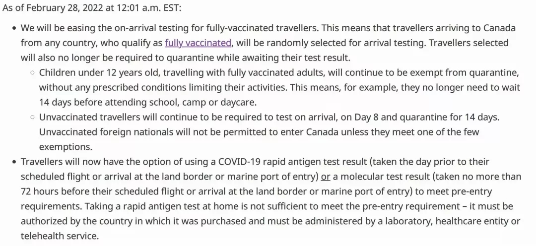 當地時間周二,加拿大衛生部長杜克洛斯宣布,從2月28日起,將取消對完全接種疫苗的旅行者要求進行入境前的PCR核酸檢測,旅行者可以選擇快速抗原檢測,PCR檢測不再是唯一選擇。