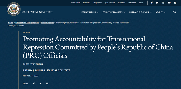 美國國務(wù)卿布林肯發(fā)表聲明說,國務(wù)院正在針對一些中國官員采取簽證限制措施。