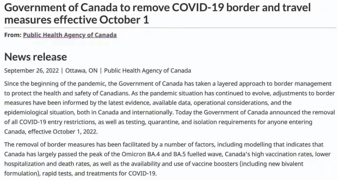 加拿大聯邦政府宣布,10月1日起,將取消所有COVID-19 入境限制