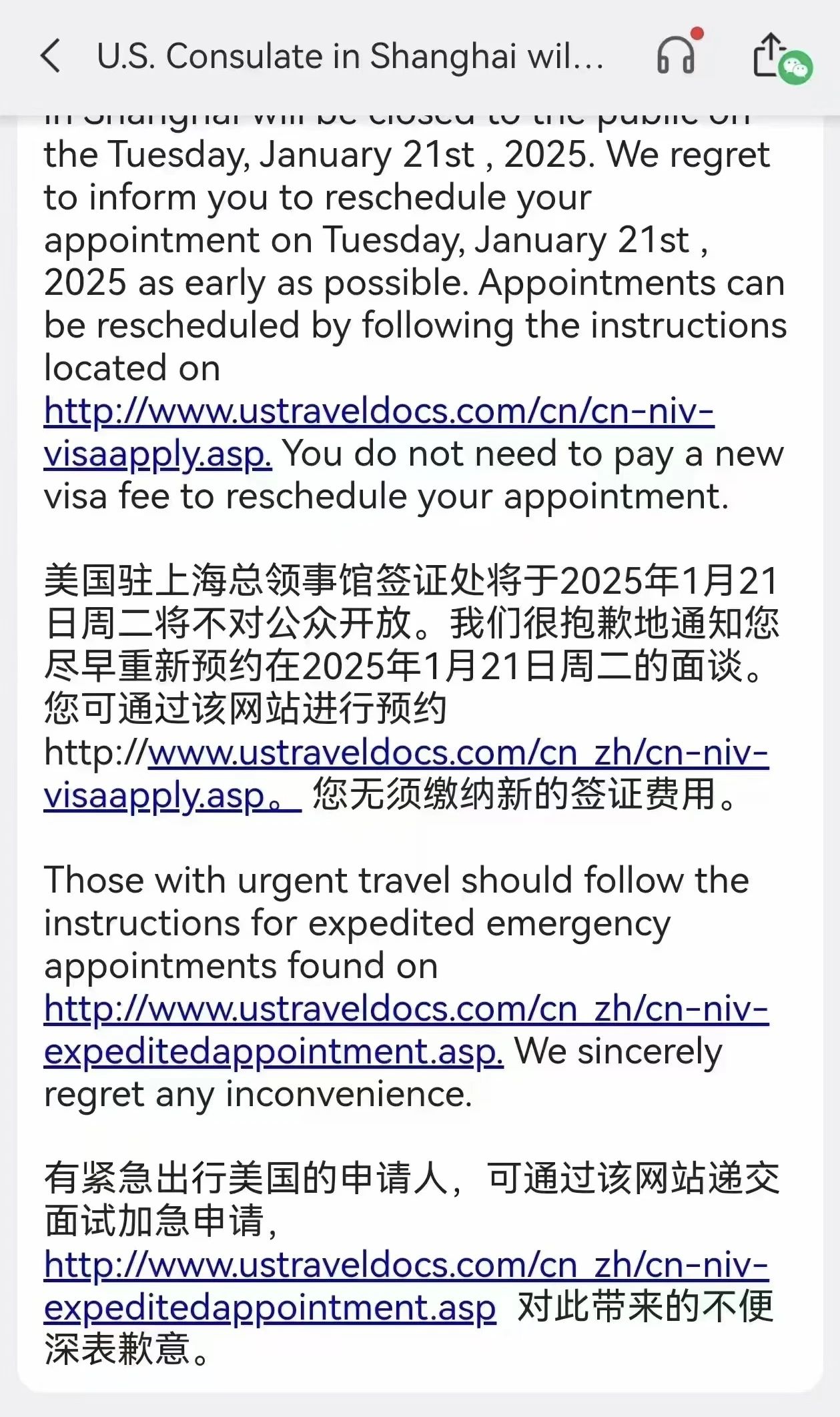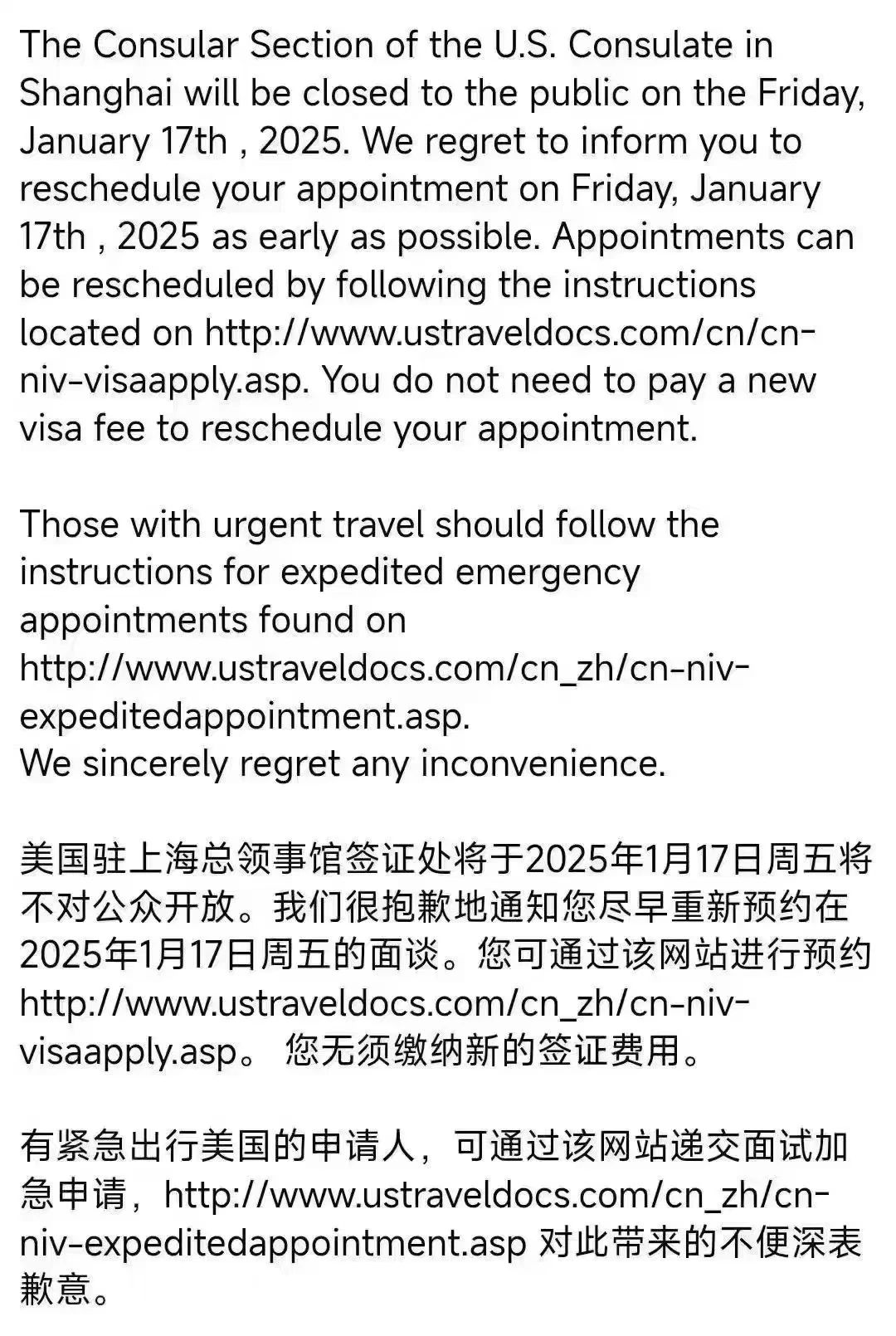 12月20日,所有美國駐華使領館發布通知,臨時取消12.24所有面試。不少申請人今天收到通知:明年1月17日及1月21日的美國簽證面談被取消!