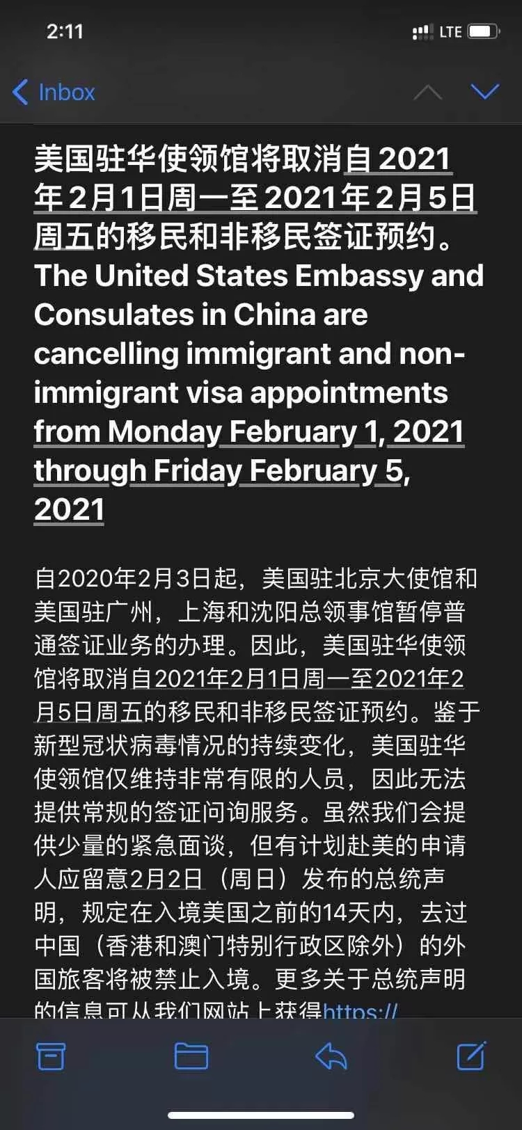 將取消自2021年2月1日(周一)至2月5日(周五)的移民和非移民簽證預約。