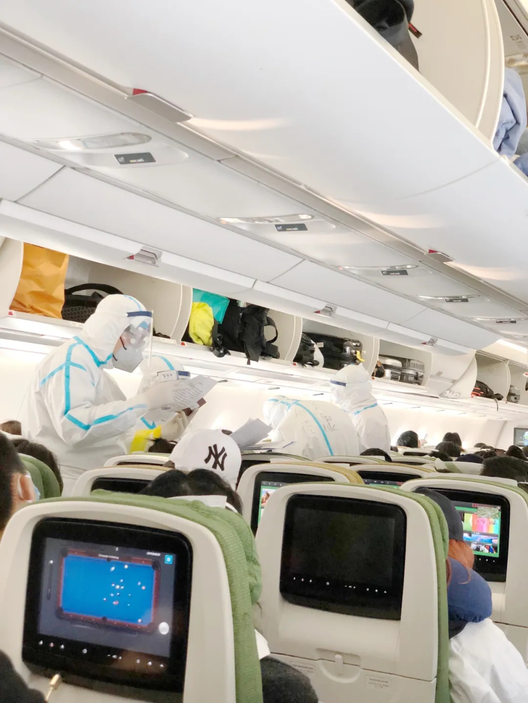 15:40 檢疫人員上機進行檢疫, 分四隊, 從兩側走廊前后一次進行體溫檢查
