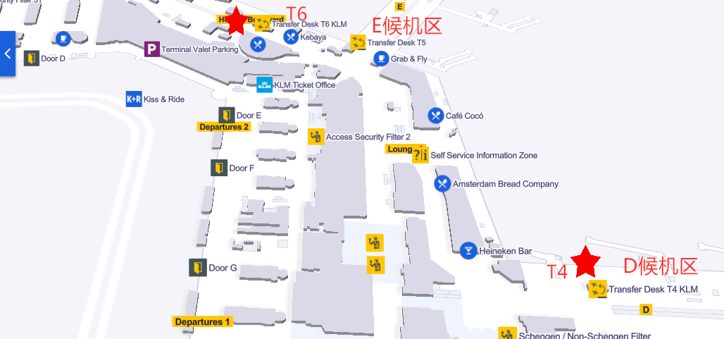 目前大部分旅客都通過南航,東航和廈航飛往中國。如果你的客票是分開購買的兩張票,爭取在第一站值機時領取后程的登機牌。如果你在第一站沒有拿到后續飛往中國的登機牌,請在到達史基浦機場后前往T6(E登機區)或T4(D登機區)轉機柜臺,領取下一程的機票。如果你是行李直掛且候機時間較長的旅客,建議攜帶行李托運小票前往轉機柜臺,確認行李是否被直掛到目的地。 *轉機柜臺具體位置請查看下方紅星標記處。