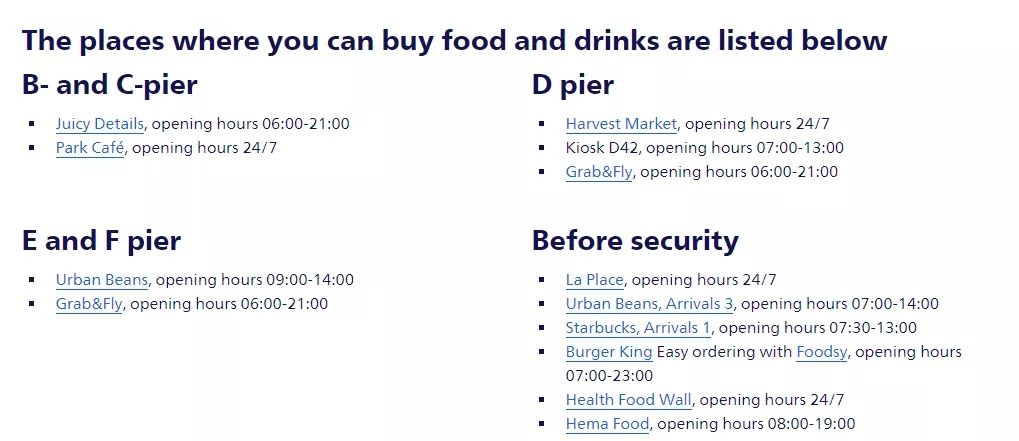 出于安全考慮,機場大部分的餐廳均已關閉。現在僅有少量的外帶餐廳和食品商店開門。具體可以參考下方的圖片。請注意,這些商店的營業時間可能會根據旅客人數和政策隨時會有變化,還望諒解。