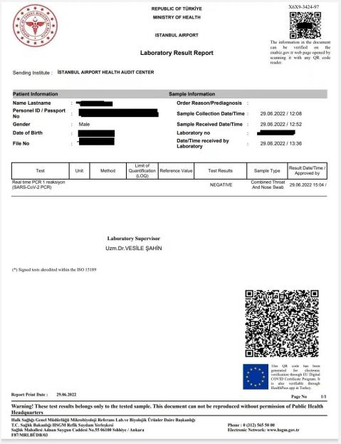(三)檢測可選擇土耳其衛生部認可的任一合法檢測機構,且該機構可出具帶二維碼的標準格式核酸報告。模板如下:
