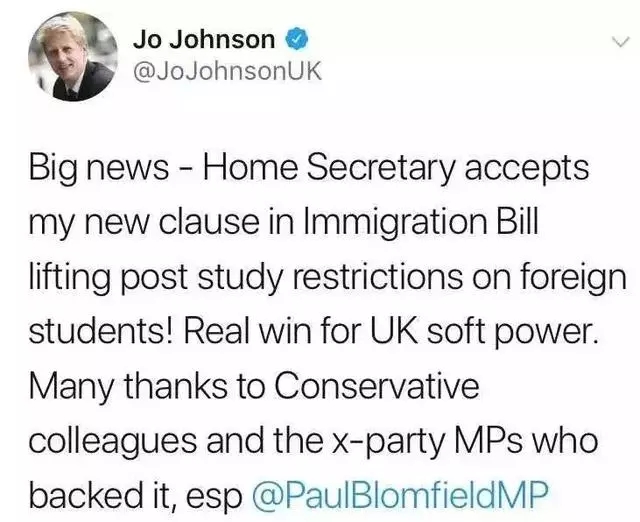 今年6月,英國議員Johnson連發(fā)多條推特,表示他已向移民局提出新政重新開放PSW簽證,希望盡快實現(xiàn)這一提案。