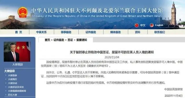 據中國駐英國大使館網站消息,因疫情原因,現宣布暫時停止在英國人員持目前有效中國簽證及工作類、私人事務類和團聚類居留許可入境中國。中國駐英國使(領)館將不為上述人員簽發《健康狀況聲明書》。