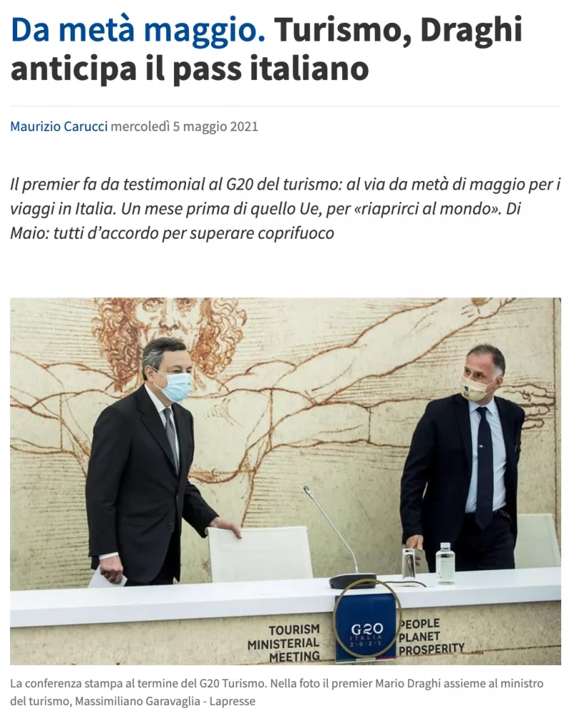 2021年5月4日,意大利主辦的G20旅游峰會(huì)在網(wǎng)上舉行,意大利總理馬里奧·德拉吉與旅游部長(zhǎng)馬西莫·加拉瓦格里亞共同主持了新聞發(fā)布會(huì)。