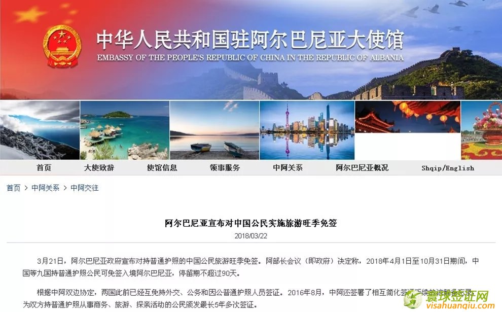 3月21日,阿爾巴尼亞政府宣布對(duì)持普通護(hù)照的中國公民旅游旺季免簽。阿部長會(huì)議(即政府)決定稱,2018年4月1日至10月31日期間,中國等九國持普通護(hù)照公民可免簽入境阿爾巴尼亞,停留期不超過90天。