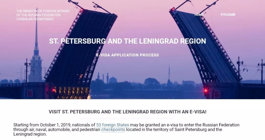 2019年10月1日起,持普通護照或公務普通護照的中國公民可登陸俄羅斯外交部網站免費申請赴圣彼得堡和列寧格勒州的電子簽證。
