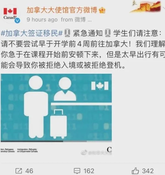 5月29日早上,加拿大駐中國領事館官方微博發博,證實“拒絕入境”措施!提醒留學生們請勿在開學日4星期以前嘗試入境,太早出行有可能導致,被拒絕入境或拒絕登機!