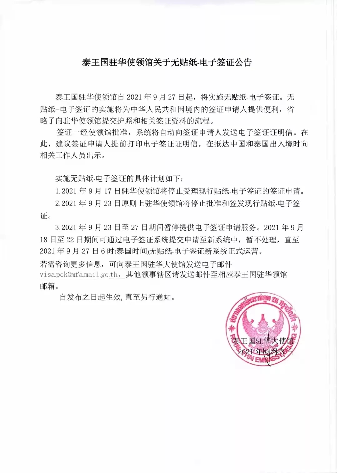 泰國駐華使館發布公告,將于9月27日起實施無貼紙-電子簽證政策,對中國申請人發放“電子簽證證明信”,申請人提交簽證后,系統將自動向簽證申請人發送電子簽證證明信。出入境時打印帶好。