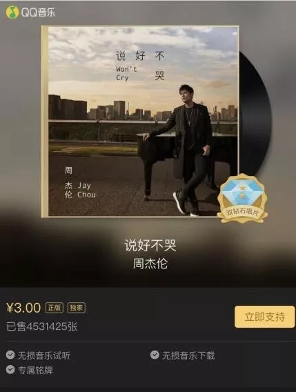 Jay式心疼情歌重磅回歸!短短一小時內(nèi),僅QQ音樂數(shù)字專輯就售出288萬張,按每張3元計,新歌一小時收入就高達(dá)近900萬元。截止目前,新歌各平臺累計總售量468萬張,預(yù)計收入將近1400多萬!
