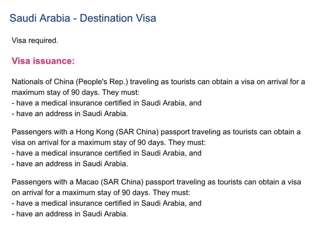 好消息來了!天起,沙特正式對(duì)包括中國游客在內(nèi)的49個(gè)國家公民,實(shí)施落地簽政策。入境沙特不超過90天。游客需準(zhǔn)備一份涵蓋沙特境內(nèi)的醫(yī)療保險(xiǎn)以及提供一個(gè)沙特境內(nèi)的地址。
