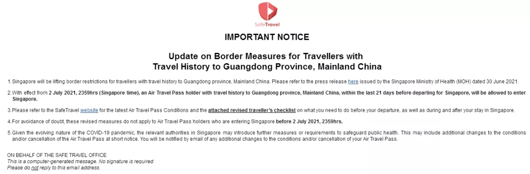 自2021年7月2日起,新加坡時(shí)間23:59時(shí)起,持有航空旅行證且在前往新加坡前的21天內(nèi)有前往中國(guó)大陸廣東省的旅行歷史的人,可獲準(zhǔn)進(jìn)入新加坡。(按照之前入境時(shí)核酸檢測(cè)陰性后即可自由活動(dòng))