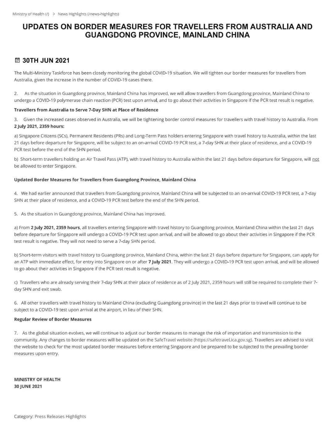 新加坡衛(wèi)生部6月30日發(fā)布關(guān)于入境新規(guī)定: