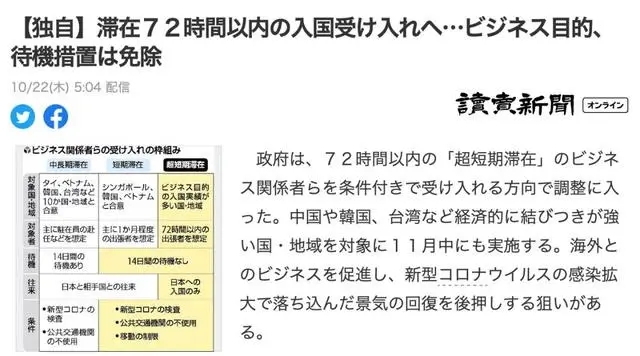 據日本政府官員10月22日向媒體披露的消息,日本政府正計劃允許在日本停留72小時以內的外國商務人士進入日本。